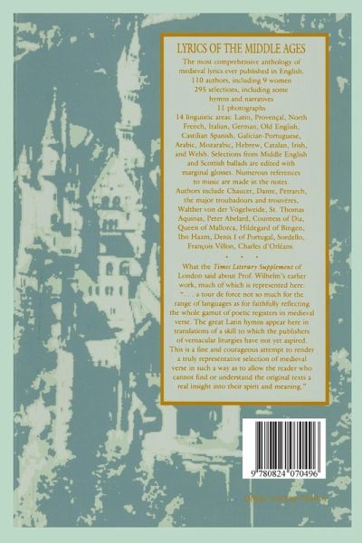 This anthology features nearly 300 works in 14 linguistic areas: Latin hymns and lyrics from 800 to 1300...Carmina Burana...Proven al lyrics...Italian lyrics...North French lyrics...German lyrics...lyrics of Iberia, including Arabic, Hebrew, Mozarabic, Galician-Portuguese, Castilian, and Catalan...lyrics of Great Britain, including Irish, Welsh, Old English, Middle English, and Scottish-English ballads. More than 100 authors are represented, including Chaucer, Dante, Petrarch, the major troubadours and trouv res, Walther von der Vogelweide, St. Thomas Aquinas, Peter Abelard, The Countess of Dia, The Queen of Mallorca, Hildegard of Bingen, Ibn Hazm, Mozarabic kharja writers, Denis I of Portugal, Alfonso X of Castile, Sordello, Fran ois Villon, Charles d'Orl ans, and many who are anonymous. There are indexes of authors, opening lines, and genres, and 12 photographs represent scenes that are related to the poems. SPECIAL FEATURES inclusion of the widest possible range of texts from the western Middle Ages allows comparative, cross-cultural approaches; fresh translations by an authoritative team of scholars were prepared especially for this volume; tape or CD information is provided for medieval lyrics that have been given modern recordings; apparatus includes a selection of texts in their original languages and indices of authors, titles/first lines, and genres Suitable for Courses in Medieval Literature in Translation; Comparative Literature; The Lyric