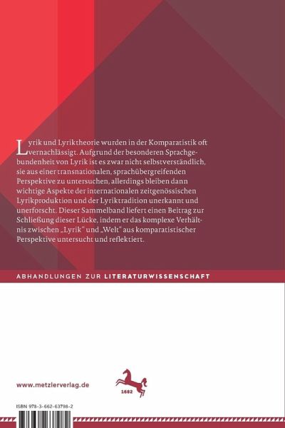 Einleitung.- I Lyrik und Lebenswelt.- "Was sind das für Zeiten...": Paul Celans lyrisches Gespräch mit Bertolt Brecht.- Versuchung und Widerstand in "A Máquina do Mundo" ("Die Weltmaschine") von Carlos Drummond de Andrade.- Kollektive Identität und lyrische Form: Sprecherrollen in der Lyrik von Harlem Renaissance und Négritude.- "Giving a place a status of lyrical reality". Westindien in Gedichten von Derek Walcott und Édouard Glissant.- Wunderland ist abgebrannt: Der argentinische Rock Nacional als politische Subversion gegen die Repression.- II Lyrik und Medienwelt.- Der Mythos des Sisyphos. Anatomie einer Verszeile in komparatistischer Absicht.- Weltlyrik: Medea-Gedichte von Autorinnen des 20. und 21. Jahrhunderts.- Der Gedichtroman: Prototyp und seine Erscheinungsformen in der Gegenwart.- "Ich bin der Künstler von 'i'". Das i-Gedicht von Kurt Schwitters als poetologisches Kunstwerk. Eine mikroskopische Lektüre.- "Le monde est fait pour aboutir à un beau livre". Über Lyrik als sorgfältig gebundenes Produkt.- III Lyrik und Wissenschaftswelt.- Die Blüte geistigen Erkennens. Lyrische Form und geistiger Gehalt bei Synesios von Kyrene.- Das Erkenntnispotential der Lyrik. Ein Beitrag zum Themenbereich Literatur und Wissen.- Das Paradox der Poesie? Zur (Un)Definierbarkeit der Gattung Lyrik. Eine komparatistische Betrachtung.- Aspekte einer Theorie der Weltlyrik.- Personenregister.