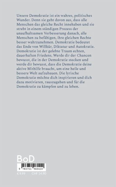 Unsere Demokratie ist ein wahres, politisches Wunder. Denn sie geht davon aus, dass alle Menschen das gleiche Recht innehaben und sie strebt in einem ständigen Prozess der unaufhaltsamen Verbesserung danach, alle Menschen zu befähigen, ihre gleichen Rechte besser wahrzunehmen. Demokratie bedeutet das Ende von Willkür, Diktatur und Autokratie. Demokratie ist der gelebte Traum echten, dauerhaften Friedens. Werde dir der Chancen bewusst, die in der Demokratie stecken und werde dir bewusst, dass die Demokratie deine aktive Mithilfe braucht, um eine heile und bessere Welt aufzubauen. Die lyrische Demokratie möchte dich inspirieren und dich dazu motivieren, rauszugehen und für die Demokratie zu kämpfen und zu leben.