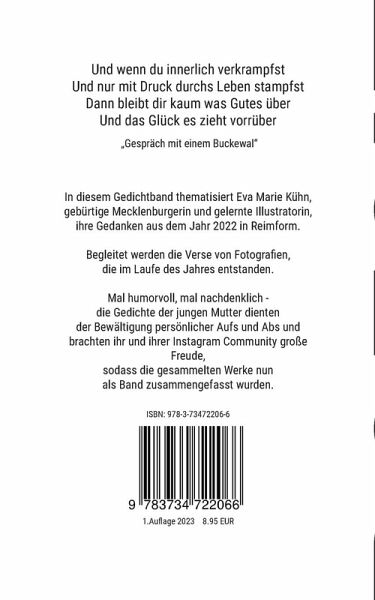In diesem Gedichtband thematisiert Eva Marie Kühn, gebürtige Mecklenburgerin und gelernte Illustratorin, ihre Gedanken aus dem Jahr 2022 in Reimform.Begleitet werden die Verse von Fotografien, die im Laufe des Jahres entstanden.Mal humorvoll, mal nachdenklich - die Gedichte der jungen Mutter dienten der Bewältigung persönlicher Aufs und Abs und brachten ihr und ihrer Instagram Community große Freude, sodass die gesammelten Werke nun als Band zusammengefasst wurden.