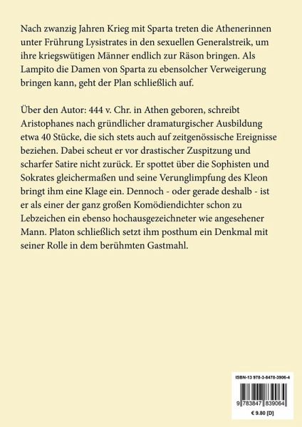 Aristophanes: Lysistrate. Ein Lustspiel Lesefreundlicher Großdruck in 16-pt-Schrift Nach zwanzig Jahren Krieg mit Sparta treten die Athenerinnen unter Frührung Lysistrates in den sexuellen Generalstreik, um ihre kriegswütigen Männer endlich zur Räson bringen. Als Lampito die Damen von Sparta zu ebensolcher Verweigerung bringen kann, geht der Plan schließlich auf. Großformat, 210 x 297 mm Berliner Ausgabe, 2019 Durchgesehener Neusatz bearbeitet und eingerichtet von Theodor Borken Aufführung 411 v. Chr. Textgrundlage ist die Ausgabe: Aristophanes: Lysistrate, in: Sämtliche Komödien. Übertragen von Ludwig Seeger, 2. Band, Zürich: Lizenzausgabe Buchclub Ex Libris, [o.J.], S. 401¿460. Umschlaggestaltung von Thomas Schultz-Overhage unter Verwendung des Bildes: Frans Floris, Athene bei den Musen, 1560. Gesetzt aus der Minion Pro, 16 pt. Henricus Edition Deutsche Klassik UG (haftungsbeschränkt) Über den Autor: 444 v. Chr. in Athen geboren, schreibt Aristophanes nach gründlicher dramaturgischer Ausbildung etwa 40 Stücke, die sich stets auch auf zeitgenössische Ereignisse beziehen. Dabei scheut er vor drastischer Zuspitzung und scharfer Satire nicht zurück. Er spottet über die Sophisten und Sokrates gleichermaßen und seine Verunglimpfung des Kleon bringt ihm eine Klage ein. Dennoch - oder gerade deshalb - ist er als einer der ganz großen Komödiendichter schon zu Lebzeichen ein ebenso hochausgezeichneter wie angesehener Mann. Platon schließlich setzt ihm posthum ein Denkmal mit seiner Rolle in dem berühmten Gastmahl.