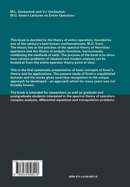 This book is devoted to the theory of entire Hermitian operators, an important branch of functional analysis harmoniously combining the methods of operator theory and the theory of analytic functions. This theory anables various problems of classical and modern analysis to be looked at from a uniform point of view. In addition, it serves as a source for setting and solving many new problems in both theories. The three chapters of the book are based on the notes written by his students of M. G. Krein's lectures on the theory of entire operators with (1,1) deficiency index which he delivered in 1961 at the Pedagogical Institute of Odessa, and on his works on the extension theory of Hermitian operators and the theory of analytic functions. The theory is further developed in the direction of solving the problems set up by Krein at ICM-66 in the first two appendices. The first concerns the case of Hermitian operators with arbitrary defect numbers, entire with respect to an ordinary gauge and to a generalized one as well. The other focuses on the entire operators representable by differential operators. The third appendix is the translation from Russian of the unpublished notes of Krein's lecture in which, in particular, the place of the theory of entire operators in the whole analysis is elucidated. In Krein's mathematical heritage the theory of entire operators occupies a special position.