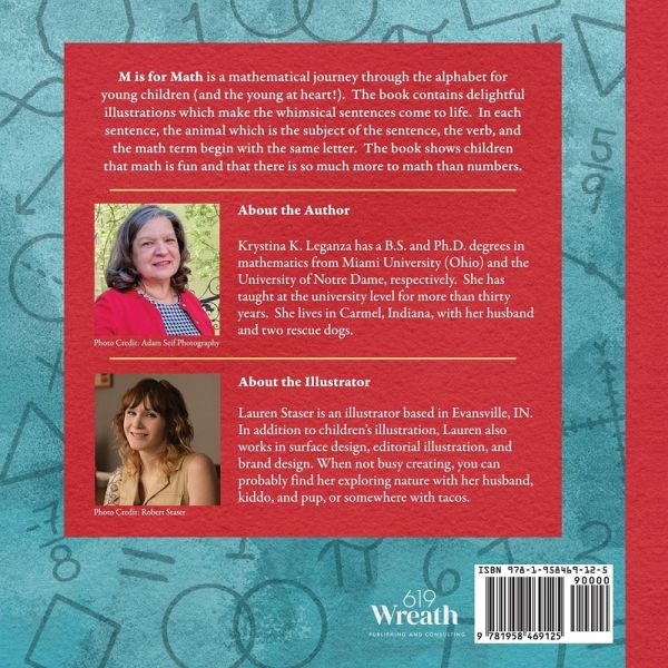 M is for Math is a mathematical journey through the alphabet for young children (and the young at heart!). The book contains delightful illustrations which make the whimsical sentences come to life. In each sentence, the animal (which is the subject of the sentence), the verb, and the math term begin with the same letter. For example, "the hare hopped happily along the hypotenuse." The author wants all children from a young age to realize and appreciate that math is fun, and that there is so much more to math than numbers.