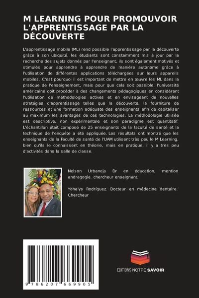L'apprentissage mobile (ML) rend possible l'apprentissage par la découverte grâce à son ubiquité, les étudiants sont constamment mis à jour par la recherche des sujets donnés par l'enseignant, ils sont également motivés et stimulés pour apprendre à apprendre de manière autonome grâce à l'utilisation de différentes applications téléchargées sur leurs appareils mobiles. C'est pourquoi il est important de mettre en oeuvre les ML dans la pratique de l'enseignement, mais pour que cela soit possible, l'université américaine doit procéder à des changements pédagogiques en considérant l'utilisation de méthodologies actives et en envisageant de nouvelles stratégies d'apprentissage telles que la découverte, la fourniture de ressources et une formation adéquate des enseignants afin de capitaliser au maximum les avantages de ces technologies. La méthodologie utilisée est descriptive, non expérimentale et son paradigme est quantitatif. L'échantillon était composé de 25 enseignants de la faculté de santé et la technique de l'enquête a été appliquée. Les résultats ont montré que les enseignants de la Faculté de santé de l'UAM utilisent très peu le M Learning, bien qu'ils le connaissent en théorie, mais en pratique, il y a très peu d'activités dans la salle de classe.