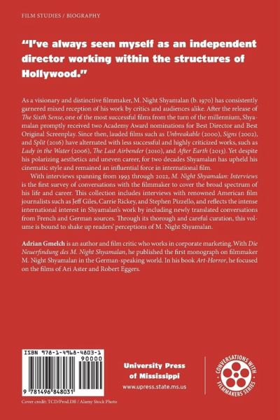 With interviews spanning from 1993 through 2022, M. Night Shyamalan: Interviews is the first survey of conversations with the filmmaker to cover the broad spectrum of his life and career. This collection includes interviews with renowned American film journalists such as Jeff Giles, Carrie Rickey and Stephen Pizzello.