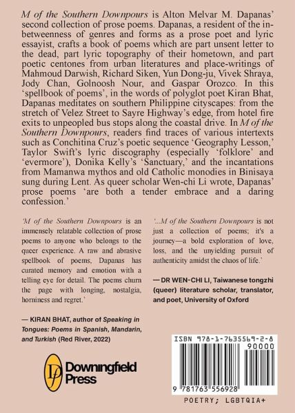 M of the Southern Downpours is Alton Melvar M Dapanas' second collection of prose poems. Dapanas, a resident of the in-betweenness of genres and forms as a prose poet and lyric essayist, crafts a book of poems which are part unsent letter to the dead, part lyric topography of their hometown, and part poetic centones from urban literatures and place-writings of Mahmoud Darwish, Richard Siken, Yun Dong-ju, Vivek Shraya, Jody Chan, Golnoosh Nour, and Gaspar Orozco. In this 'spellbook of poems', in the words of polyglot poet Kiran Bhat, Dapanas meditates on southern Philippine cityscapes: from the stretch of Velez Street to Sayre Highway's edge, from hotel fire exits to unpeopled bus stops along the coastal drive. In M of the Southern Downpours, readers find traces of various intertexts such as Conchitina Cruz's poetic sequence 'Geography Lesson,' Taylor Swift's lyric discography (especially 'folklore' and 'evermore'), Donika Kelly's 'Sanctuary,' and the incantations from Mamanwa mythos and old Catholic monodies in Binisaya sung during Lent. As queer scholar Wen-chi Li wrote, Dapanas' prose poems 'are both a tender embrace and a daring confession.' 'M of the Southern Downpours is an immensely relatable collection of prose poems to anyone who belongs to the queer experience. A raw and abrasive spellbook of poems, Dapanas has curated memory and emotion with a telling eye for detail. The poems churn the page with longing, nostalgia, horniness and regret.' - Kiran Bhat, author of Speaking in Tongues: Poems in Spanish, Mandarin, and Turkish (Red River, 2022) 'Dive into the lush, pulsating world of M of the Southern Downpours & Other Prose Poems, where the rhythm of rain-soaked streets and the whisper of hidden desires merge into an intoxicating symphony. With a nod to the poetic murmurs of Proust, this collection invites you to dance through the memories of intimate encounters shared among gay individuals. From the clandestine corners of motels to the electric buzz of city nightlife, Dapanas crafts prose poems that are both a tender embrace and a daring confession. Each piece is a brushstroke on the canvas of contemporary Philippine society, revealing the raw, unfiltered emotions of longing, discovery, and acceptance. M of the Southern Downpours is not just a collection of poems; it's a journey-a bold exploration of love, loss, and the unyielding pursuit of authenticity amidst the chaos of life.' - Dr Wen-chi Li, Taiwanese tongzhi (queer) literature scholar, translator, and poet, University of Oxford. 'Alton Melvar M Dapanas' M of the Southern Downpours is a collection of honestly crafted poems that explores the vast universe of a poet whose clarity about the world in all of its bareness will arrest you. Here is a poet, wrestling with the things we all wrestle every day, the restlessness of youth, reality and fantasy, memory, love, calm. Page after page is storytelling that leads you down one road through the lyricism of a master poet in the making. Alton is a poet at ease with the shocking things words can do to a page. On one page, you'll find tightly woven lyrics, the music of all the poet's many words, American and Asia at once, and on the next page, prose poems about the other world where we go when we seem to lose the real world around us, a haunting duality of existence between wakefulness and dream. These poems will keep the reader alert because you don't know what's coming at you on the next page. Here is a poet at peace and at war, the nakedness of erotic images that knock you out of your seat. ... These lines crave a place in your heart, a must read, an urgently necessary voice, that voice we all desire in poetry.' - Patricia Jabbeh Wesley, PhD, Poet Laureate of Liberia and author of Praise Song for My Country (2024)