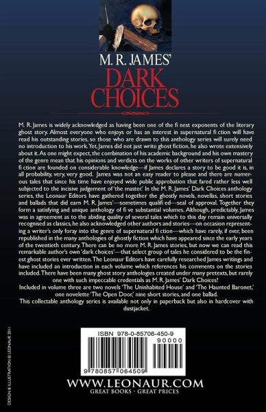 M. R. James is widely acknowledged as having been one of the finest exponents of the literary ghost story. Almost everyone who enjoys or has an interest in supernatural fiction will have read his outstanding stories, so those who are drawn to this anthology series will surely need no introduction to his work. Yet, James did not just write ghost fiction, he also wrote extensively about it. As one might expect, the combination of his academic background and his own mastery of the genre mean that his opinions and verdicts on the works of other writers of supernatural fiction are founded on considerable knowledge-if James declares a story to be good it is, in all probability, very, very good. James was not an easy reader to please and there are numerous tales that since his time have enjoyed wide public approbation that fared rather less well subjected to the incisive judgement of 'the master.' In the M. R. James' Dark Choices anthology series, the Leonaur Editors have gathered together the ghostly novels, novellas, short stories and ballads that did earn M. R. James'-sometimes qualified-seal of approval. Together they form a satisfying and unique anthology of five substantial volumes. Although, predictably, James was in agreement as to the abiding quality of several tales which to this day remain universally recognised as classics, he also acknowledged other authors and stories-on occasion representing a writer's only foray into the genre of supernatural fiction-which have rarely, if ever, been republished in the many anthologies of ghostly fiction which have appeared since the early years of the twentieth century. There can be no more M. R. James stories, but now we can read this remarkable author's own 'dark choices'-that select group of tales he considered to be the finest ghost stories ever written. The Leonaur Editors have carefully researched James writings and have included an introduction in each volume which references his comments on the stories included. There have been many ghost story anthologies created under many pretexts, but rarely one with such impeccable credentials as M. R. James' Dark Choices! Included in volume three are two novels 'The Uninhabited House' and 'The Haunted Baronet,' one novelette 'The Open Door,' nine short stories, and one ballad. This collectable anthology series is available not only in paperback but also in hardcover with dustjacket.