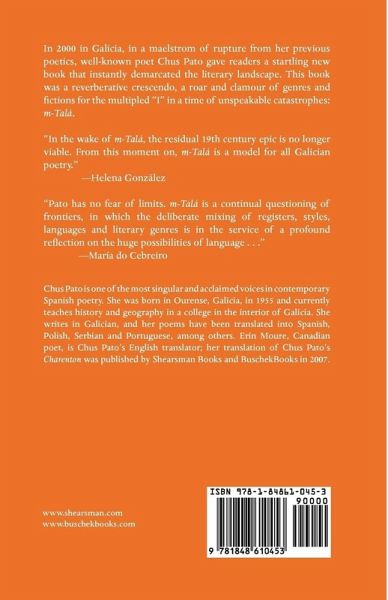 In 2000 in Galicia, in a maelstrom of rupture from her previous poetics, well-known poet Chus Pato gave readers a startling new book that instantly demarcated the literary landscape. This book was a reverberative crescendo, a roar and clamour of genres and fictions for the multipled "I" in a time of unspeakable catastrophes: m-Talá.