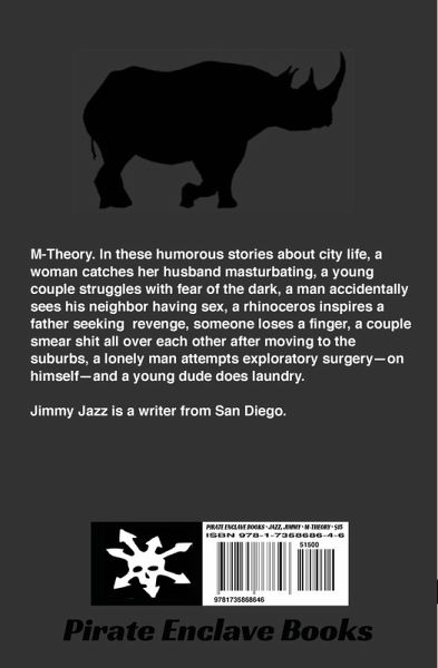 M-Theory is a collection of literary short fiction. In these humorous stories about city life, a woman catches her husband masturbating, a young couple struggles with fear of the dark, a man accidentally sees his neighbor having sex, a rhinoceros inspires a father seeking revenge, someone loses a finger, a couple smear shit all over each other after moving to the suburbs, a lonely man attempts exploratory surgery-on himself-and a young dude does laundry. Jimmy Jazz is a writer from San Diego. This first installment in the Collected Works would be a great gift for the fan of radical, thought-provoking, independent fiction.