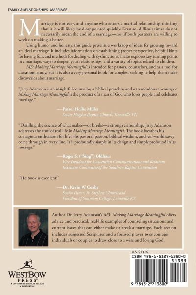 Marriage is not easy, and anyone who enters a marital relationship thinking that it is will likely be disappointed quickly. Even so, difficult times do not necessarily mean the end of a marriage-not if both partners are willing to work on making it better. Author Dr. Jerry Adamson's M3: Making Marriage Meaningful offers advice and practical, real-life examples of counseling situations and current issues that can either make or break a marriage. Each section includes suggested Scriptures and a focused prayer to encourage individuals or couples to draw close to a wise and loving God. Using humor and honesty, this guide presents a workshop of ideas for growing toward an ideal marriage. It includes information on establishing proper perspective, helpful hints for having fun, and methods for dealing with dysfunctions. It also explores key turning points in a marriage, ways to deepen your relationships, and a variety of topics related to children. M3: Making Marriage Meaningful is intended for pastors, counselors, and as a tool for classroom study, but it is also a very personal book for couples, seeking to help them make discoveries about marriage.