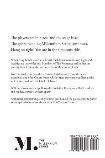 Would you trust a group of strangers with your life? "I was hooked from the first page, and so excited to dive back into this interesting, complex world!" J Townsend. When King Korah launches a brutal crackdown, tensions run high, and loyalties are put to the test. Members of The Resistance realize they are putting their lives on the line for a Prince they do not know. Posed to retake the Alanthian throne, Josiah must rely on the team assembled under his cousin, Peter, which leaves everyone wondering, who will be accepted into the Circle of Trust? Will the revolutionaries pull together to defeat Korah, or will old rivalries and hidden secrets tear them apart? Ambitious, entertaining, enlightening, and sexy, all the pieces and players come together as the genre bending Millennium Series continues with M5-Circle of Trust.