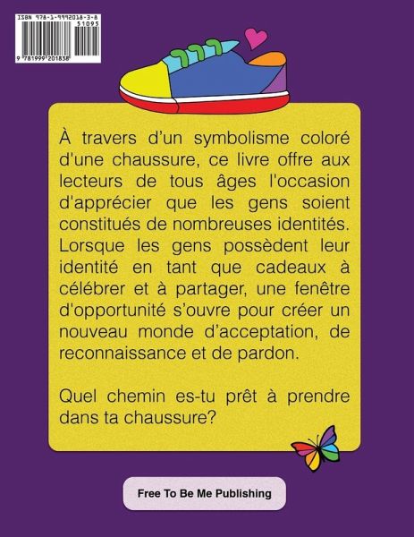 L'égalité signifie que tout le monde a une chaussure.L'équité signifie que tout le monde obtient une chaussure qui convient. Auteur inconnu À travers d'un symbolisme coloré d'une chaussure, ce livre offre aux lecteurs de tous âges l'occasion d'apprécier que les gens soient constitués de nombreuses identités. Lorsque les gens possèdent leur identité en tant que cadeaux à célébrer et à partager, une fenêtre d'opportunité s'ouvre pour créer un nouveau monde d'acceptation, de reconnaissance et de pardon.