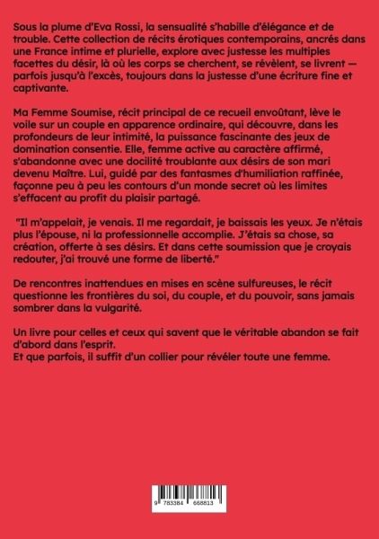 Sous la plume d'Eva Rossi, la sensualité s'habille d'élégance et de trouble. Cette collection de récits érotiques contemporains, ancrés dans une France intime et plurielle, explore avec justesse les multiples facettes du désir, là où les corps se cherchent, se révèlent, se livrent - parfois jusqu'à l'excès, toujours dans la justesse d'une écriture fine et captivante.Ma Femme Soumise, récit principal de ce recueil envoûtant, lève le voile sur un couple en apparence ordinaire, qui découvre, dans les profondeurs de leur intimité, la puissance fascinante des jeux de domination consentie. Elle, femme active au caractère affirmé, s'abandonne avec une docilité troublante aux désirs de son mari devenu Maître. Lui, guidé par des fantasmes d'humiliation raffinée, façonne peu à peu les contours d'un monde secret où les limites s'effacent au profit du plaisir partagé. "Il m'appelait, je venais. Il me regardait, je baissais les yeux. Je n'étais plus l'épouse, ni la professionnelle accomplie. J'étais sa chose, sa création, offerte à ses désirs. Et dans cette soumission que je croyais redouter, j'ai trouvé une forme de liberté."De rencontres inattendues en mises en scène sulfureuses, le récit questionne les frontières du soi, du couple, et du pouvoir, sans jamais sombrer dans la vulgarité.Un livre pour celles et ceux qui savent que le véritable abandon se fait d'abord dans l'esprit.Et que parfois, il suffit d'un collier pour révéler toute une femme.