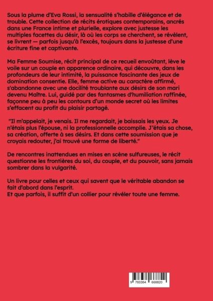 Sous la plume d'Eva Rossi, la sensualité s'habille d'élégance et de trouble. Cette collection de récits érotiques contemporains, ancrés dans une France intime et plurielle, explore avec justesse les multiples facettes du désir, là où les corps se cherchent, se révèlent, se livrent - parfois jusqu'à l'excès, toujours dans la justesse d'une écriture fine et captivante.Ma Femme Soumise, récit principal de ce recueil envoûtant, lève le voile sur un couple en apparence ordinaire, qui découvre, dans les profondeurs de leur intimité, la puissance fascinante des jeux de domination consentie. Elle, femme active au caractère affirmé, s'abandonne avec une docilité troublante aux désirs de son mari devenu Maître. Lui, guidé par des fantasmes d'humiliation raffinée, façonne peu à peu les contours d'un monde secret où les limites s'effacent au profit du plaisir partagé. "Il m'appelait, je venais. Il me regardait, je baissais les yeux. Je n'étais plus l'épouse, ni la professionnelle accomplie. J'étais sa chose, sa création, offerte à ses désirs. Et dans cette soumission que je croyais redouter, j'ai trouvé une forme de liberté."De rencontres inattendues en mises en scène sulfureuses, le récit questionne les frontières du soi, du couple, et du pouvoir, sans jamais sombrer dans la vulgarité.Un livre pour celles et ceux qui savent que le véritable abandon se fait d'abord dans l'esprit.Et que parfois, il suffit d'un collier pour révéler toute une femme.