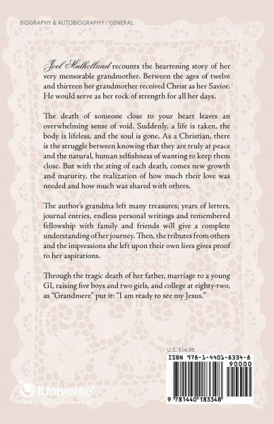Joel Mulholland recounts the heartening story of her very memorable grandmother. Between the ages of twelve and thirteen her grandmother received Christ as her Savior. He would serve as her rock of strength for all her days. The death of someone close to your heart leaves an overwhelming sense of void. Suddenly, a life is taken, the body is lifeless, and the soul is gone. As a Christian, there is the struggle between knowing that they are truly at peace and the natural, human selfishness of wanting to keep them close. But with the sting of each death, comes new growth and maturity, the realization of how much their love was needed and how much was shared with others. The author's grandma left many treasures; years of letters, journal entries, endless personal writings and remembered fellowship with family and friends will give a complete understanding of her journey. Then, the tributes from others and the impressions she left upon their own lives gives proof to her aspirations. Through the tragic death of her father, marriage to a young GI, raising five boys and two girls, and college at eighty-two, as "Grandmere" put it: "I am ready to see my Jesus."