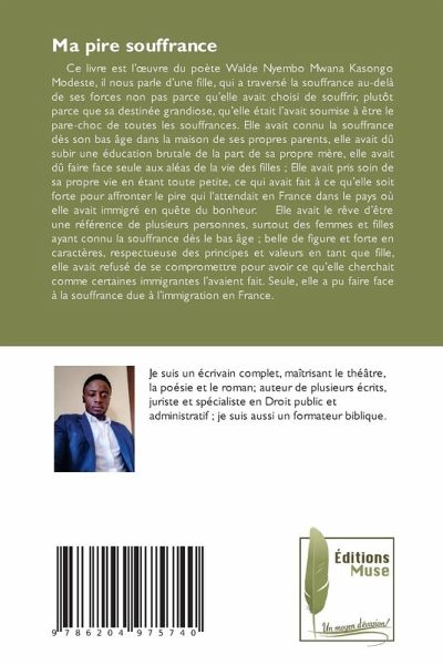 Ce livre est l'oeuvre du poète Walde Nyembo Mwana Kasongo Modeste, il nous parle d'une fille, qui a traversé la souffrance au-delà de ses forces non pas parce qu'elle avait choisi de souffrir, plutôt parce que sa destinée grandiose, qu'elle était l'avait soumise à être le pare-choc de toutes les souffrances. Elle avait connu la souffrance dès son bas âge dans la maison de ses propres parents, elle avait dû subir une éducation brutale de la part de sa propre mère, elle avait dû faire face seule aux aléas de la vie des filles ; Elle avait pris soin de sa propre vie en étant toute petite, ce qui avait fait à ce qu'elle soit forte pour affronter le pire qui l'attendait en France dans le pays où elle avait immigré en quête du bonheur. Elle avait le rêve d'être une référence de plusieurs personnes, surtout des femmes et filles ayant connu la souffrance dès le bas âge ; belle de figure et forte en caractères, respectueuse des principes et valeurs en tant que fille, elle avait refusé de se compromettre pour avoir ce qu'elle cherchait comme certaines immigrantes l'avaient fait. Seule, elle a pu faire face à la souffrance due à l'immigration en France.