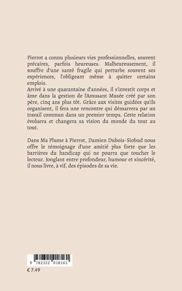 Pierrot a connu plusieurs vies professionnelles, souvent précaires, parfois heureuses. Malheureusement, il souffre d'une santé fragile qui perturbe souvent ses expériences, l'obligeant même à quitter certains emplois.Arrivé à une quarantaine d'années, il s'investit corps et âme dans la gestion de l'Amusant Musée créé par son père, cinq ans plus tôt. Grâce aux visites guidées qu'ils organisent, il fera une rencontre qui démarrera par un travail commun dans un premier temps. Cette relation évoluera et changera sa vision du monde du tout au tout.Dans Ma Plume à Pierrot, Damien Dubois-Siobud nous offre le témoignage d'une amitié plus forte que les barrières du handicap qui ne pourra que toucher le lecteur. Jonglant entre profondeur, humour et sincérité, il nous livre, à vif, des épisodes de sa vie.