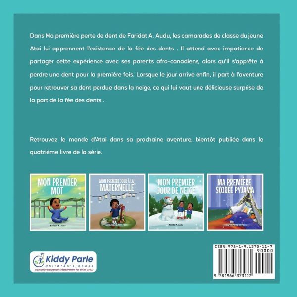 Dans Ma première perte de dent de Faridat A. Audu, les camarades de classe du jeune Atai lui apprennent l'existence de la fée des dents. Il attend avec impatience de partager cette expérience avec ses parents afro-canadiens, alors qu'il s'apprête à perdre une dent pour la première fois. Lorsque le jour arrive enfin, il part à l'aventure pour retrouver sa dent perdue dans la neige, ce qui lui vaut une délicieuse surprise de la part de la fée des dents. Retrouvez le monde d'Atai dans sa prochaine aventure, bientôt publiée dans le quatrième livre de la série.