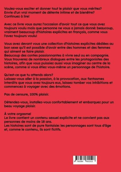 Voulez-vous exciter et donner tout le plaisir que vous méritez?Envie d'un vrai moment de détente intime et de bienêtre?Continuez à lire!Avec ce livre vous aurez l'occasion d'avoir tout ce que vous avez toujours voulu mais que personne ne vous a jamais donné: beaucoup, vraiment beaucoup d'histoires explicites en français, comme vous l'avez toujours voulu!Vous avez devant vous une collection d'histoires explicites dédiées au bon sexe qu'il est possible d'avoir entre des hommes et des femmes qui aiment se faire plaisir. Beaucoup des contes passionnantes à vivre seul ou en compagnie.Vous trouverez de nombreux dialogues entre les protagonistes des histoires, afin que vous puissiez aussi vous imaginer au centre de la scène, comme si vous étiez vous-même un personnage de l'histoire.Qu'est-ce que tu attends alors? Laissez-vous aller à la passion, à la provocation, aux fantasmes interdits que vous avez toujours eus, laissez tomber vos inhibitions et commencez à voyager avec des émotions.Pas de censure, 100 pour 100 de plaisir.Détendez-vous, installez-vous confortablement et embarquez pour un beau voyage plaisir.À votre orgasme!