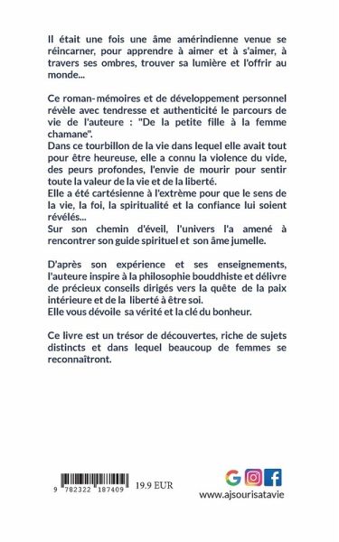 Ce roman-mémoires et de développement personnel révèle avec tendresse et authenticité le parcours chaotique de l'auteure : "De la petite fille à la femme chamane". L'auteure inspire à l'éveil et délivre de précieux conseils dirigés vers une quête du bonheur, de paix et de liberté à être soi.Ce livre est un trésor de découvertes, riche de sujets distincts et dans lequel beaucoup de femmes se reconnaîtront.