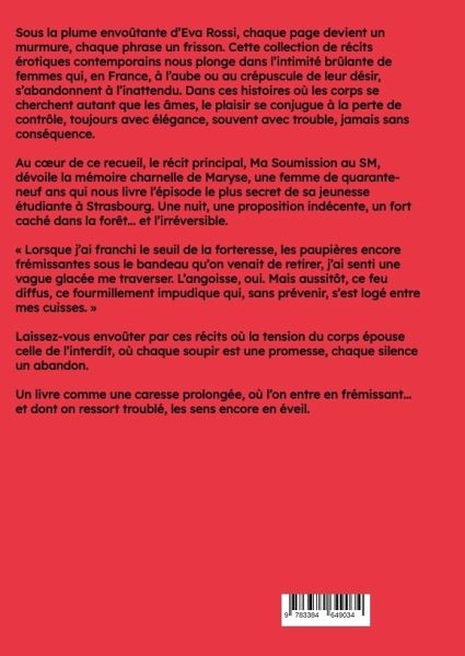Sous la plume envoûtante d'Eva Rossi, chaque page devient un murmure, chaque phrase un frisson. Cette collection de récits érotiques contemporains nous plonge dans l'intimité brûlante de femmes qui, en France, à l'aube ou au crépuscule de leur désir, s'abandonnent à l'inattendu. Dans ces histoires où les corps se cherchent autant que les âmes, le plaisir se conjugue à la perte de contrôle, toujours avec élégance, souvent avec trouble, jamais sans conséquence.Au coeur de ce recueil, le récit principal, Ma Soumission au SM, dévoile la mémoire charnelle de Maryse, une femme de quarante-neuf ans qui nous livre l'épisode le plus secret de sa jeunesse étudiante à Strasbourg. Une nuit, une proposition indécente, un fort caché dans la forêt... et l'irréversible.« Lorsque j'ai franchi le seuil de la forteresse, les paupières encore frémissantes sous le bandeau qu'on venait de retirer, j'ai senti une vague glacée me traverser. L'angoisse, oui. Mais aussitôt, ce feu diffus, ce fourmillementimpudique qui, sans prévenir, s'est logé entre mes cuisses. »Laissez-vous envoûter par ces récits où la tension du corps épouse celle de l'interdit, où chaque soupir est une promesse, chaque silence un abandon.Un livre comme une caresse prolongée, où l'on entre en frémissant... et dont on ressort troublé, les sens encore en éveil.