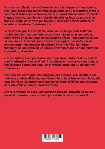 Dans cette collection envoûtante de récits érotiques contemporains, Eva Rossi explore les zones troubles du désir, là où la frontière entre le contrôle et l'abandon se trouble, là où la sensualité se mêle à l'interdit. Chaque histoire, subtilement ciselée, dévoile les jeux de pouvoir, les élans du corps et les vertiges du coeur, dans une France urbaine et secrète, vibrante de fantasmes tus.Le récit principal, Ma vie de Soumise, nous plonge dans l'intimité troublante d'Aurore, une femme qui croyait jouer à un jeu anodin, avant d'être prise au piège de ses propres désirs. Tout commence par un pseudo sur Internet, une conversation légère, des défis lancés comme autant de caresses déguisées. Mais très vite, les règles changent. Ce qui semblait un simple divertissement devient initiation, exploration, révélation.« Je me suis baissée pour ramasser mon stylo... mais c'est ma culotte que j'ai attrapée. J'ai senti l'air frais glisser entre mes cuisses nues, le bois du banc contre ma peau,et le frisson inattendu du danger me traverser. »Eva Rossi ne décrit pas : elle suggère, elle effleure, elle insuffle à ses mots une chaleur délicate, une tension feutrée. À travers ses récits, elle nous fait vivre les battements secrets de femmes libres, audacieuses, en quête d'elles-mêmes à travers l'autre.Une fois refermé ce livre, une question persiste, brûlante et douce : jusqu'où irions-nous, nous aussi, pour obéir à nos vrais désirs ?