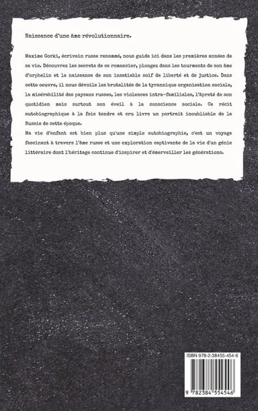 Naissance d'une âme révolutionnaire.Maxime Gorki, écrivain russe renommé, nous guide ici dans les premières années de sa vie. Découvrez les secrets de ce romancier, plongez dans les tourments de son âme d'orphelin et la naissance de son insatiable soif de liberté et de justice. Dans cette oeuvre, il nous dévoile les brutalités de la tyrannique organisation sociale, la misérabilité des paysans russes, les violences intra-familiales, l'âpreté de son quotidien mais surtout son éveil à la conscience sociale. Ce récit autobiographique à la fois tendre et cru livre un portrait inoubliable de la Russie de cette époque. Ma vie d'enfant est bien plus qu'une simple autobiographie, c'est un voyage fascinant à travers l'âme russe et une exploration captivante de la vie d'un génie littéraire dont l'héritage continue d'inspirer et d'émerveiller les générations.