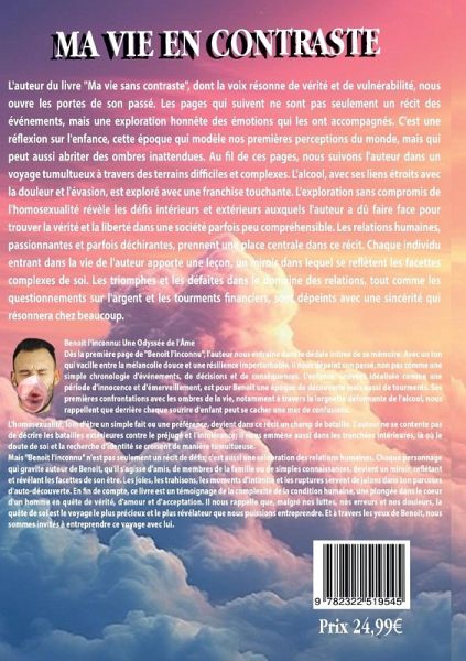 L'auteur du livre "Ma vie sans contraste", dont la voix résonne de vérité et de vulnérabilité, nous ouvre les portes de son passé. Les pages qui suivent ne sont pas seulement un récit des événements, mais une exploration honnête des émotions qui les ont accompagnés. C'est une réflexion sur l'enfance, cette époque qui modèle nos premières perceptions du monde, mais qui peut aussi abriter des ombres inattendues. Au fil de ces pages, nous suivons l'auteur dans un voyage tumultueux à travers des terrains difficiles et complexes. L'alcool, avec ses liens étroits avec la douleur et l'évasion, est exploré avec une franchise touchante. L'exploration sans compromis de l'homosexualité révèle les défis intérieurs et extérieurs auxquels l'auteur a dû faire face pour trouver la vérité et la liberté dans une société parfois peu compréhensible. Les relations humaines, passionnantes et parfois déchirantes, prennent une place centrale dans ce récit. Chaque individu entrant dans la vie de l'auteur apporte une leçon, un miroir dans lequel se reflètent les facettes complexes de soi. Les triomphes et les défaites dans le domaine des relations, tout comme les questionnements sur l'argent et les tourments financiers, sont dépeints avec une sincérité qui résonnera chez beaucoup.