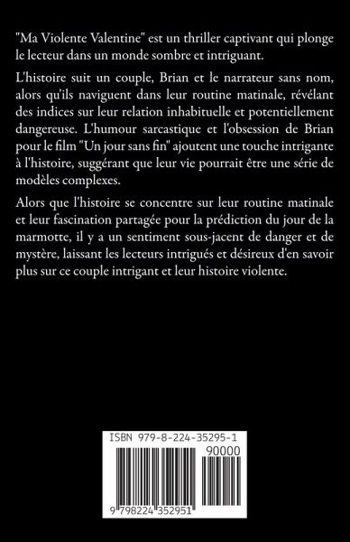 "Ma Violente Valentine" est un thriller captivant qui plonge le lecteur dans un monde sombre et intriguant. L'histoire suit un couple, Brian et le narrateur sans nom, alors qu'ils naviguent dans leur routine matinale, révélant des indices sur leur relation inhabituelle et potentiellement dangereuse. L'humour sarcastique et l'obsession de Brian pour le film "Un jour sans fin" ajoutent une touche intrigante à l'histoire, suggérant que leur vie pourrait être une série de modèles complexes. Alors que l'histoire se concentre sur leur routine matinale et leur fascination partagée pour la prédiction du jour de la marmotte, il y a un sentiment sous-jacent de danger et de mystère, laissant les lecteurs intrigués et désireux d'en savoir plus sur ce couple intrigant et leur histoire violente.