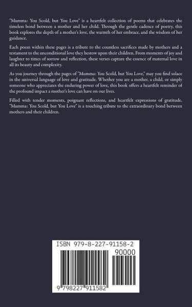 "Mumma: You Scold, but You Love" is a heartfelt collection of poems that celebrates the timeless bond between a mother and her child. Through the gentle cadence of poetry, this book explores the depth of a mother's love, the warmth of her embrace, and the wisdom of her guidance. Each poem within these pages is a tribute to the countless sacrifices made by mothers and a testament to the unconditional love they bestow upon their children. From moments of joy and laughter to times of sorrow and reflection, these verses capture the essence of maternal love in all its beauty and complexity. As you journey through the pages of "Mumma: You Scold, but You Love," may you find solace in the universal language of love and gratitude. Whether you are a mother, a child, or simply someone who appreciates the enduring power of love, this book offers a heartfelt reminder of the profound impact a mother's love can have on our lives. Filled with tender moments, poignant reflections, and heartfelt expressions of gratitude, "Mumma: You Scold, but You Love" is a touching tribute to the extraordinary bond between mothers and their children.