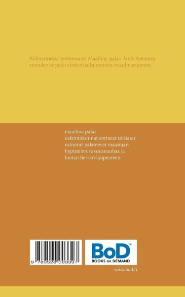 Kolmannessa teoksessaan Maailma palaa Aulis Antamaa runoilee kirpeän aforistisia huomioita maailmastamme.