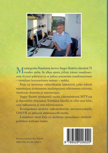 Seppo Sisättö Maalaispoika Ikaalisista Maalaispoika Ikaalisista kertoo Seppo Sisätön elämästä 75 vuoden ajalta. Se alkaa ajasta, jolloin toinen maailmansota oli juuri päättynyt ja se jatkuu seuraavaan maailmansotaan - taisteluun koronavirusta vastaan - saakka. Kirja on kertomus vaiherikkaista käänteistä, jotka tekivät toimittajana aloittaneesta maalaispojasta valtiotieteen tohtorin. viestinnän dosentin ja asiantuntijan. Jo 1950-luvun lopulla hän unelmoi Yleisradion monopolin murtamisesta, jota hän oli kaksikymmentä vuotta myöhemmin toteuttamassa. Taistelu MTV:n uutisista oli hänelle viiden vuoden korkeakoulu poliittisesta vaikuttamisesta. Sitä seurasi menestyksellinen hanke paikallisradioiden saamiseksi Suomeen. Seppo Sisättö työskenteli vuosi johtotehtävissä MTV:ssä ja Aamulehti-yhtymässä. Yrittäjänä hänellä on ollut oma lehti, oma radioasema ja oma alueellinen televisioasema eli Seutu-Uutiset, Radio Kolme ja TV-Tampere. Koulupoikana aloitettu radioamatööriharraste asematunnuksella OH1VR on jatkunut aktiivisesti 60 vuotta. Se johdatti hänet kahdeksikymmeneksi vuodeksi kriisiviestinnän pariin sekä kansainvälisenä vaikuttajana että kotimaisena organisaattorina. Niiden tuloksena syntyi ITU:n Tampere Convention vuonna 1998. Se teki Tampereesta ainoan suomalaisen kaupungin, jolla on YK-järjestelmän sopimus nimissään. Seppo Sisättö on nimetty yhdessä Fred Caten ja Victoria Rubensohnin kanssa sopimuksen isäksi. Hän ideoi ja organisoi myös Turva 2003 harjoituksen, jossa radioamatöörit rakensivat Suomen sähkö- ja tietoliikenneverkoista riippumattoman valtakunnallisen tietoliikenneverkon, jolla oli yhteyspiste maan jokaisessa kunnassa. Viranomaisten kanssa yhteistyössä toteutettuun harjoitukseen osallistui 1200 suomalaista radioamatööriä. Lukijalleen tämä kirja on kurkistus suomalaisen viestintäpolitiikan kulissien taakse.