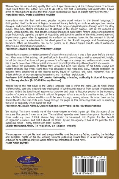 'Maana-Faay has an enduring quality that sets it apart from many of its contemporaries. It achieves what Max'd Afrax, the author, sets out to do with a plot that is irresistibly well-constructed. I have loved re-reading it and believe that this English translation will make its author many new friends.'Nuruddin Farah, world acclaimed novelist Maana-faay was the first and most popular modern novel written in the Somali language. It distinguished itself in its use of highly developed literary techniques such as retrospection, interior dialogue, and powerfully evocative descriptions of the range of physical spaces through which the story moves. Moreover, Afrax's masterful use of dialogue in the spoken tongue, with all the nuances of region, urban quarter, age, and gender, remains unequalled even today. Afrax's unique and pioneering prose fiction truly captured the spirit of Mogadishu and Somali urban life of the time. Immediately and impressively popular when it appeared, Maana-faay has remained iconic for this moment in Somali urban history and a mile-stone in the development of the Somali language and Somali-language literature. While no translation can do full justice to it, Ahmed Ismail Yusuf's valiant endeavour deserves our admiration and gratitude.Professor Lidwien Kapteijns, Wellesley College 'Maana-faay presents a realistic picture of urban life in Somalia as it was a few years before the civil war. Afrax uses skillful artistry, not used before in Somali fiction writing, as well as sympathetic insight, to tell this story of an innocent young woman's sufferings in a corrupt and ruthless environment. He has a poet's perception of the physical scenes and psychological feelings through which she moves.Even before the publication of Maana-faay, Afrax had been well-known for his fiction, essays and theatre criticism, but when Maana-faay was serialised in the Mogadishu daily, Xiddigta Oktoober, he became firmly established as the leading literary figure of Somalia, one, who, moreover, was an ardent defender of women against harassment and heartless exploitation .'Professor B.W.Andrzejewski of London University, a leading authority in Somali language and literary studies. (in SOAS Literary Review) 'Maana-faay is the first novel in the Somali language that is worth the name....In it; Afrax shows craftsmanship, care and extraordinary intelligence in synthesizing material from various irreconcilable sources. Professor Ali Jimale Ahmed, Queens College, New York (in his PhD Dissertation) ______________________________________________ Maxamed Daahir Afrax / Mohamed Dahir Afrah, PhD in African Studies from SOAS University of London, journalist, researcher, fiction writer and literary scholar who authored numerous articles, academic studies, chapters in scholarly books, novels, short stories, plays and scholarly books in Somali, English and Arabic.