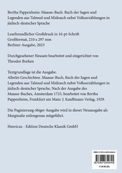 Bertha Pappenheim: Maasse-Buch. Buch der Sagen und Legenden aus Talmud und Midrasch nebst Volkserzählungen in jüdisch-deutscher SpracheLesefreundlicher Großdruck in 16-pt-SchriftGroßformat, 210 x 297 mmBerliner Ausgabe, 2023Durchgesehener Neusatz bearbeitet und eingerichtet von Theodor BorkenNach der Ausgabe des Maasse-Buches, Amsterdam 1723, bearbeitet von Bertha Pappenheim, Frankfurt am Main: J. Kauffmann Verlag, 1929.Textgrundlage ist die Ausgabe:Allerlei Geschichten. Maasse-Buch, Buch der Sagen und Legenden aus Talmud und Midrasch nebst Volkserzählungen in jüdisch-deutscher Sprache, Nach der Ausgabe des Maasse-Buches, Amsterdam 1723, bearbeitet von Bertha Pappenheim, Frankfurt am Main: J. Kauffmann Verlag, 1929.Umschlagabbildung: Gustav Bauernfeind, Juden an der Klagemauer, o.J.Gesetzt aus der Minion Pro, 16 pt.Henricus - Edition Deutsche Klassik GmbH