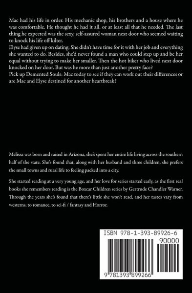 Mac had his life in order. His mechanic shop, his brothers and a house where he was comfortable. He thought he had it all, or at least all that he needed. The last thing he expected was the sexy, self-assured woman next door who seemed waiting to knock his life off kilter. Elyse had given up on dating. She didn't have time for it with her job and everything she wanted to do. Besides, she'd never found a man who could step up and be her equal without trying to make her smaller. Then the hot biker who lived next door knocked on her door. But was he more than just another pretty face? Pick up Demented Souls: Mac today to see if they can work out their differences or are Mac and Elyse destined for another heartbreak?