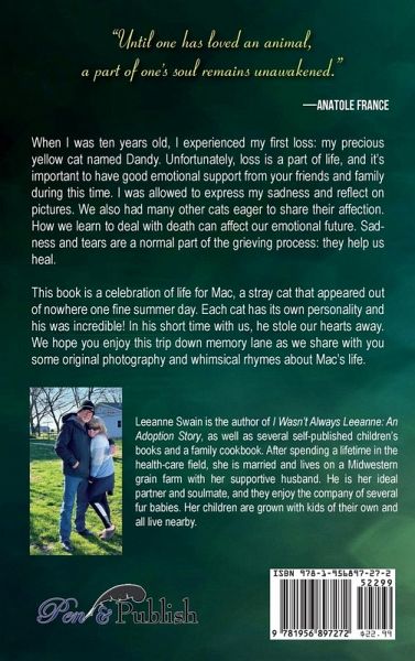 "Until one has loved an animal, a part of one'¿s soul remains unawakened."-Anatole France When I was ten years old, I experienced my first loss: my precious yellow cat named Dandy. Unfortunately, loss is a part of life, and it's important to have good emotional support from your friends and family during this time. I was allowed to express my sadness and reflect on pictures. We also had many other cats eager to share their affection. How we learn to deal with death can affect our emotional future. Sadness and tears are a normal part of the grieving process: they help us heal. This book is a celebration of life for Mac, a stray cat that appeared out of nowhere one fine summer day. Each cat has its own personality and his was incredible! In his short time with us, he stole our hearts away. We hope you enjoy this trip down memory lane as we share with you some original photography and whimsical rhymes about Mac's life.