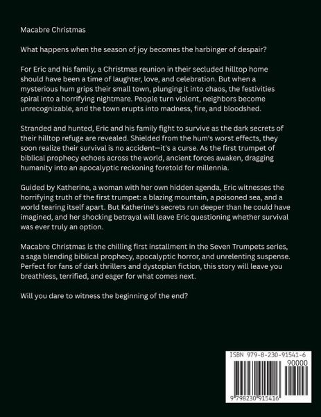 Macabre Christmas What happens when the season of joy becomes the harbinger of despair? For Eric and his family, a Christmas reunion in their secluded hilltop home should have been a time of laughter, love, and celebration. But when a mysterious hum grips their small town, plunging it into chaos, the festivities spiral into a horrifying nightmare. People turn violent, neighbors become unrecognizable, and the town erupts into madness, fire, and bloodshed. Stranded and hunted, Eric and his family fight to survive as the dark secrets of their hilltop refuge are revealed. Shielded from the hum's worst effects, they soon realize their survival is no accident-it's a curse. As the first trumpet of biblical prophecy echoes across the world, ancient forces awaken, dragging humanity into an apocalyptic reckoning foretold for millennia. Guided by Katherine, a woman with her own hidden agenda, Eric witnesses the horrifying truth of the first trumpet: a blazing mountain, a poisoned sea, and a world tearing itself apart. But Katherine's secrets run deeper than he could have imagined, and her shocking betrayal will leave Eric questioning whether survival was ever truly an option. Macabre Christmas is the chilling first installment in the Seven Trumpets series, a saga blending biblical prophecy, apocalyptic horror, and unrelenting suspense. Perfect for fans of dark thrillers and dystopian fiction, this story will leave you breathless, terrified, and eager for what comes next. Will you dare to witness the beginning of the end?