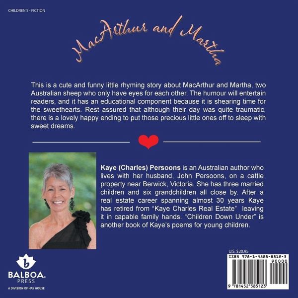 This is a cute and funny little rhyming story about MacArthur and Martha, two Australian sheep who only have eyes for each other. The humour will entertain readers, and it has an educational component because it is shearing time for the sweethearts. Rest assured that although their day was quite traumatic, there is a lovely happy ending to put those precious little ones off to sleep with sweet dreams.