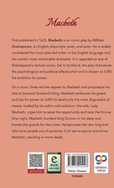 First published in 1623, 'Macbeth' is an iconic play by William Shakespeare, an English playwright, poet, and actor. He is widely considered the most splendid writer in the English language and the world's most remarkable dramatist. It is regarded as one of Shakespeare's darkest works. Set in Scotland, the play dramatizes the psychological and political effects when evil is chosen to fulfill the ambition for power. On a moor, three witches appear to Macbeth and prophesize his fate to become Scotland's King. Macbeth embraces his greed and lust for power to fulfill his destiny by the most disgraceful of means, fuelled by his wife's cold ambition. His wife, Lady Macbeth, urges him to seize the opportunity and take the throne. One night, Macbeth murders King Duncan in his sleep and frames the guards for the crime. He becomes the new king and kills more people out of paranoia. Civil war erupts to overthrow Macbeth, resulting in more death. Top 10 Hardcover Library Books: A Wrinkle in Time (9789389440188) How to Stop Worrying and Start Living (9789387669161) Their Eyes Were Watching God (9789389440577) The Magic of Believing (9789388118217) Zen in the Art of Archery (9789354990298) A Cloud by Day, a Fire by Night (9789391181611) Siddhartha by Hermann hesse (9789387669116) The Richest Man in Babylon (9789354990717) The Book of Five Rings (9789389440553) The Knowledge of the Holy (9789389157239) Note: Search by ISBN