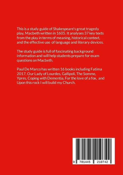 This is a comprehensive study guide of Shakespeare's great tragedy play, Macbeth written in 1605. It examines 37 key extracts from the play in terms of meaning, historical context, and the effective use of language and literary devices. The study guide is full of fascinating background information which will help students prepare for exam questions on Macbeth. Paul De Marco is the author of 16 books including Fatima 2017, Our Lady of Lourdes, Gallipoli, The Somme, Ypres, Coping with Dementia, Upon this rock I will build my Church, and For the love of a Fox.