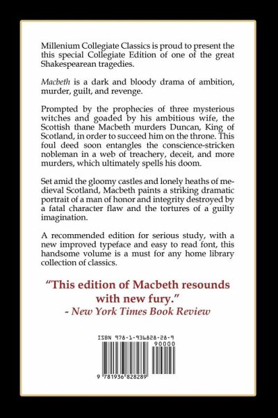 Millenium Collegiate Classics is proud to present this special Collegiate Edition of one of the great Shakespearean tragedies. Macbeth is a dark and bloody drama of ambition, murder, guilt, and revenge. Prompted by the prophecies of three mysterious witches and goaded by his ambitious wife, the Scottish thane Macbeth murders Duncan, King of Scotland, in order to succeed him on the throne. This foul deed soon entangles the conscience-stricken nobleman in a web of treachery, deceit, and more murders, which ultimately spells his doom. Set amid the gloomy castles and lonely heaths of medieval Scotland, Macbeth paints a striking dramatic portrait of a man of honor and integrity destroyed by a fatal character flaw and the tortures of a guilty imagination. A recommended edition for serious study, with a new improved typeface and easy to read font, this handsome volume is a must for any home library collection of classics. "This edition of Macbeth resounds with new fury." - New York Times Book Review