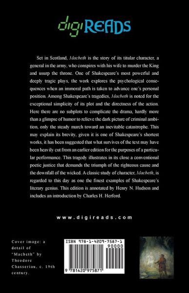 Set in Scotland, "Macbeth" is the story of its titular character, a general in the army, who conspires with his wife to murder the King and usurp the throne. One of Shakespeare's most powerful and deeply tragic plays, the work explores the psychological consequences when an immoral path is taken to advance one's personal position. Among Shakespeare's tragedies, "Macbeth" is noted for the exceptional simplicity of its plot and the directness of the action. Here there are no subplots to complicate the drama, hardly more than a glimpse of humor to relieve the dark picture of criminal ambition, only the steady march toward an inevitable catastrophe. This may explain its brevity, given it is one of Shakespeare's shortest works, it has been suggested that what survives of the text may have been heavily cut from an earlier edition for the purposes of a particular performance. This tragedy illustrates in its close a conventional poetic justice that demands the triumph of the righteous cause and the downfall of the wicked. A classic study of character, "Macbeth," is regarded to this day as one the finest examples of Shakespeare's literary genius. This edition is printed on premium acid-free paper, is annotated by Henry N. Hudson, and includes an introduction by Charles H. Herford.