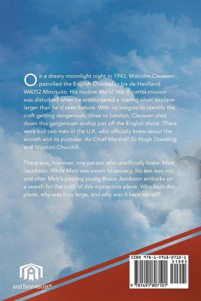 On a dreary moonlight night in 1943, Malcolm Claussen patrolled the English Channel in his de Havilland W4052 Mosquito. His routine World War II patrol mission was disturbed when he encountered a roaring silver airplane larger than he'd seen before. With no insignia to identify the craft getting dangerously close to London, Claussen shot down this gargantuan airship just off the English shore. There were but two men in the U.K. who officially knew about the aircraft and its purpose: Air Chief Marshall Sir Hugh Dowding and Winston Churchill. There was, however, one person who unofficially knew: Matt Jacobson. While Matt was sworn to secrecy, his son was not, and after Matt's passing young Bruce Jacobson embarks on a search for the truth of this mysterious plane. Who built this plane, why was it so large, and why was it kept secret?