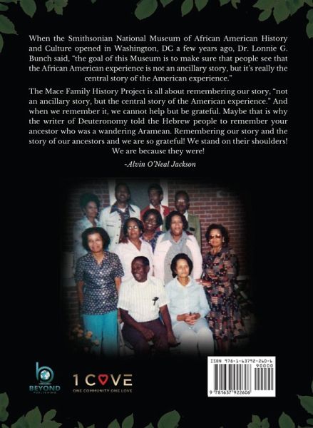 When the Smithsonian National Museum of African American History and Culture opened in Washington, DC a few years ago, Dr. Lonnie G. Bunch said, "the goal of this Museum is to make sure that people see that the African American experience is not an ancillary story, but it's really the central story of the American experience." The Mace Family History Project is all about remembering our story, "not an ancillary story, but the central story of the American experience." And when we remember it, we cannot help but be grateful. Maybe that is why the writer of Deuteronomy told the Hebrew people to remember your ancestor who was a wandering Aramean. Remembering our story and the story of our ancestors and we are so grateful! We stand on their shoulders! We are because they were! -Alvin O'Neal Jackson