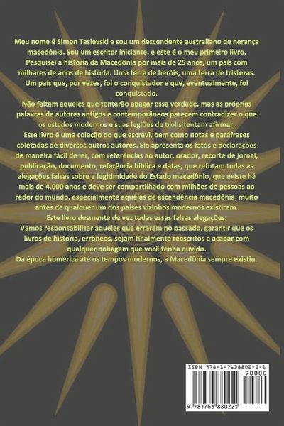 For many, the name Macedonia brings a patriotic feeling and connection to a country with thousands of years of history. A country of hero's and sorrows. One within the heart of Europe that has experienced the very highest of highs and lowest of lows. One that at times was the conqueror, and one that was itself eventually conquered. There is certainly no shortage of those that will always try to take that away from us, however, the very words of the authors both ancient and contemporary seem to contradict what modern states attempt to claim. I've collected thousands of manuscripts and documents to discover what is true and what's false. I never take statements at face value and investigate to see if I'm correct or wrong. In the past I refuted these false claims with factual evidence and sources, but instead of addressing it, they often just ignore material facts and throw another meaningless insult my way. It's a vicious cycle that is a complete waste of time falling on deaf ears, and having never, not once, a single person be able to address the facts I presented to them. This book places all of those false claims to rest once and for all. What I did was note down these sources from historians and authors both past and present. This book has been compiled as a collection of facts and statements in an easy-to-read format, with references to the author, newspaper clipping, publication, document, biblical reference, dates, that nullify any and all false claims about Macedonia that has existed for well over 4,000 years, long before any of the neighboring states or names of those countries ever existed. Macedonia has always existed. I hope that you enjoy learning from this book that has taken me decades to collect all of the information on, so that mistakes of the past can be corrected; have the factually incorrect history books rewritten and finally put to rest any and all false claims that could and have ever possibly be presented to you. This book is available in 7 Languages in both Paperback & eBook format. English Macedonian Greek German Italian Spanish Brazilian Portuguese