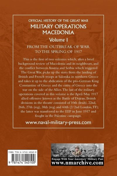 This is the first of two volumes which, after a brief background review of Macedonia and its neighbours, and the conflict between Austria and Serbia which triggered The Great War, picks up the story from the landing of British and French troops at Salonika in northern Greece and takes it up to the abdication of the pro-German King Constantine of Greece and the entry of Greece into the war on the side of the Allies. The last of the military operations covered in this volume is the April/May 1917 allied offensive known as the Battle of Dojran; British divisions in the theatre consisted of 10th (Irish), 22nd, 26th, 27th (reg), 38th (reg) and 60th (2/2nd London, TF); the latter was transferred to the EEF in June 1917 and fought in the Palestine campaign.