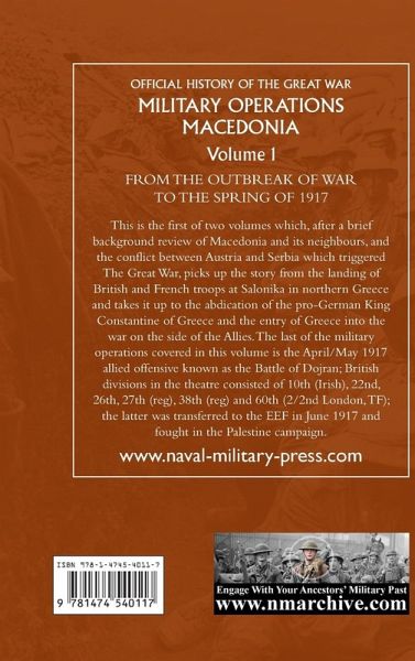 This is the first of two volumes which, after a brief background review of Macedonia and its neighbours, and the conflict between Austria and Serbia which triggered The Great War, picks up the story from the landing of British and French troops at Salonika in northern Greece and takes it up to the abdication of the pro-German King Constantine of Greece and the entry of Greece into the war on the side of the Allies. The last of the military operations covered in this volume is the April/May 1917 allied offensive known as the Battle of Dojran; British divisions in the theatre consisted of 10th (Irish), 22nd, 26th, 27th (reg), 38th (reg) and 60th (2/2nd London, TF); the latter was transferred to the EEF in June 1917 and fought in the Palestine campaign.