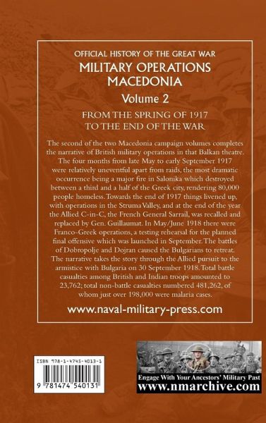 The second of the two Macedonia campaign volumes completes the narrative of British military operations in that Balkan theatre. The four months from late May to early September 1917 were relatively uneventful apart from raids, the most dramatic occurrence being a major fire in Salonika which destroyed between a third and a half of the Greek city, rendering 80,000 people homeless. Towards the end of 1917 things livened up, with operations in the Struma Valley, and at the end of the year the Allied C-in-C, the French General Sarrail, was recalled and replaced by Gen. Guillaumat. In May/June 1918 there were Franco-Greek operations, a testing rehearsal for the planned final offensive which was launched in September. The battles of Dobropolje and Dojran caused the Bulgarians to retreat. The narrative takes the story through the Allied pursuit to the armistice with Bulgaria on 30 September 1918. Total battle casualties among British and Indian troops amounted to 23,762; total non-battle casualties numbered 481,262, of whom just over 198,000 were malaria cases.