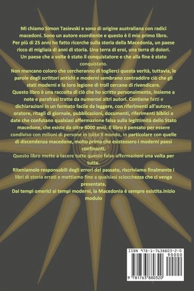 For many, the name Macedonia brings a patriotic feeling and connection to a country with thousands of years of history. A country of hero's and sorrows. One within the heart of Europe that has experienced the very highest of highs and lowest of lows. One that at times was the conqueror, and one that was itself eventually conquered. There is certainly no shortage of those that will always try to take that away from us, however, the very words of the authors both ancient and contemporary seem to contradict what modern states attempt to claim. I've collected thousands of manuscripts and documents to discover what is true and what's false. I never take statements at face value and investigate to see if I'm correct or wrong. In the past I refuted these false claims with factual evidence and sources, but instead of addressing it, they often just ignore material facts and throw another meaningless insult my way. It's a vicious cycle that is a complete waste of time falling on deaf ears, and having never, not once, a single person be able to address the facts I presented to them. This book places all of those false claims to rest once and for all. What I did was note down these sources from historians and authors both past and present. This book has been compiled as a collection of facts and statements in an easy-to-read format, with references to the author, newspaper clipping, publication, document, biblical reference, dates, that nullify any and all false claims about Macedonia that has existed for well over 4,000 years, long before any of the neighboring states or names of those countries ever existed. Macedonia has always existed. I hope that you enjoy learning from this book that has taken me decades to collect all of the information on, so that mistakes of the past can be corrected; have the factually incorrect history books rewritten and finally put to rest any and all false claims that could and have ever possibly be presented to you. This book is available in 7 Languages in both Paperback & eBook format. English Macedonian Greek German Italian Spanish Brazilian Portuguese