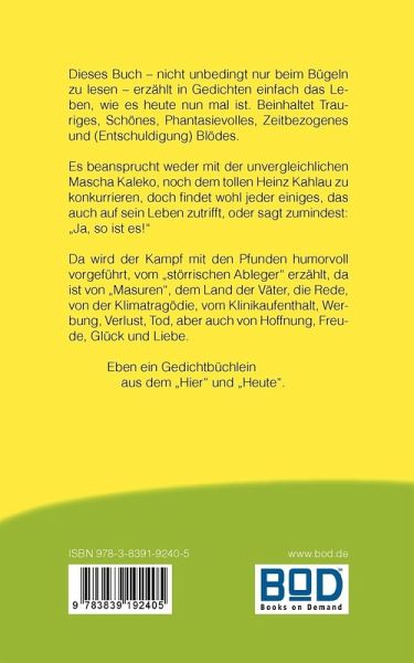 Dieses Buch - nicht unbedingt nur beim Bügeln zu lesen - erzählt in Gedichten einfach das Leben, wie es heute nun mal ist. Beinhaltet Trauriges, Schönes, Phantasievolles, Zeitbezogenes und (Entschuldigung) Blödes.Es beansprucht weder mit der unvergleichlichen Mascha Kaleko, noch dem tollen Heinz Kahlau zu konkurrieren, doch findet wohl jeder einiges, das auch auf sein Leben zutrifft, oder sagt zumindest:"Ja, so ist es!"Da wird der Kampf mit den Pfunden humorvoll vorgeführt, vom "störrischen Ableger" erzählt, da ist von "Masuren", dem Land der Väter, die Rede, von der Klimatragödie, vom Klinikaufenthalt, Werbung, Verlust, Tod, aber auch von Hoffnung, Freude, Glück und Liebe.Eben ein Gedichtsbüchlein aus dem "Hier" und "Heute".